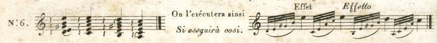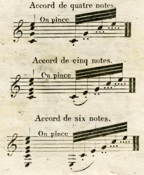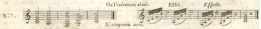 …and if one finds a chord made up of long notes, particularly in slow tempo, it would be good to execute them one after the other according to the rule indicated above, however, without abuse, which could be a detriment to good taste. In this manner, the harmony will be better supported, and it would be easier to obtain that [mode of] expression that able Masters can impart in similar cases to the pianoforte or the harp.
