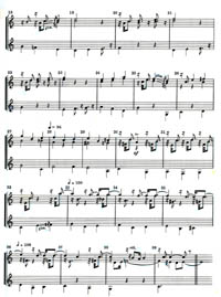 The transcription I made of this recording is, by necessity, only a rough approximation. It certainly does not look like the edition of this study as published by Segovia. We are trying to reach objective conclusions through the application of strictly subjective judgments. However, the transcription does give us sufficient information for a general examination of Segovia’s interpretative approach to this music. We can point to the excessive variations in tempo from the opening quarter = 82, gradually slowing down to quarter = 72 in m. 13, then immediately accelerating to quarter = 92 in the next measure and then still slowly accelerating to quarter = 96 in m. 28, 100 in m. 33, , 108 in m. 36 then breaking down to a halting end. Variations in tempo from a low of 72 to a high of 108 within the short framework of 39 measures, are totally out of character with the music, and, more importantly, totally out of phase with Segovia’s own conception of this piece as a Lento piece in legato, as expressed by him in his edition of it.