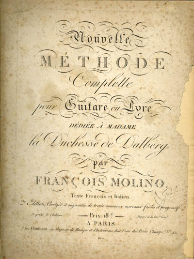 The need to arpeggiate a chord is directly related to the number of notes it contains. When the chord contains more notes than available fingers of the right hand, it becomes necessary to employ a thumb or one of the fingers on more than one string. The problem has been dealt with by guitarists many generations before the publication of the Sor Méthode in 1830. Many guitar methods, from the beginning of the eighteenth century on, addressed themselves to this question. Even before, the question was dealt with by baroque guitarists, as, quite obviously, arpeggiation relates to the rasgueado techniques of the seventeenth century. It seems though, that the first serious discussion of the question, is to be found in the respective methods of Carulli and Molino, published in Paris circa 1815. In his Nouvelle Méthode of that year, Francesco Molino discusses the problem: